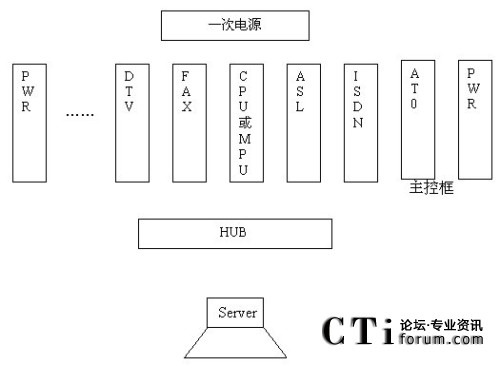 具體來說,系統(tǒng)主體結(jié)構(gòu)的交換、中繼、座席主要基于數(shù)字程控技術(shù),實(shí)現(xiàn)512路(16條數(shù)字中繼)全交換。整機(jī)外帶一臺(tái)服務(wù)器(工控機(jī)或其它電腦),主要實(shí)現(xiàn)語音數(shù)據(jù)的存取與用戶數(shù)據(jù)庫的接口,同時(shí)與主控框中的主控模塊(MPU板)共同完成接繼和流程的控制。服務(wù)器通過以太網(wǎng)與主控框中的中繼模塊(DTV板)和主控模塊(MPU板)進(jìn)行控制信息和語音數(shù)據(jù)的交互,主要由以下幾部分構(gòu)成(見下圖):