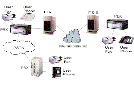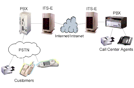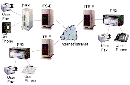 許多公司有多個辦公地點,各地之間有著頻繁的通訊往來,電話和傳真。典型地,通訊涉及到公用交換電話網(wǎng)(PSTN)或PBX間的私人連接路線。Internet電話服務(wù)器(ITS-E)提供了另一選擇。基本原理是一處用戶撥打的電話經(jīng)本地PBX路由到本地ITS-E,本地ITS-E通過IP網(wǎng)絡(luò)送到目的地ITS-E,目的地ITS-E再將電話送到目的地PBX上,最后送到目的地電話或傳真機(jī)上。