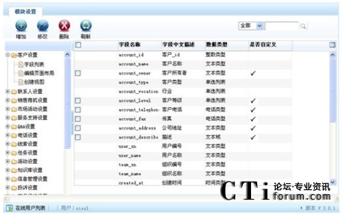 在已有模塊中可以新增字段,也可以自定義模塊后再新增字段。自定義模塊及字段可以進行修改、刪除等功能。 |