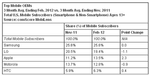 按截至今年2月份的三個(gè)月的平均數(shù)計(jì)算,美國13歲以上的手機(jī)用戶數(shù)為2.34億。三星名列手機(jī)原始設(shè)備制造商之首,占有美國手機(jī)市場(chǎng)25.6%的份額;LG電子名列第二,占有19.4%的市場(chǎng)份額;蘋果排名第三,占有13.5%的市場(chǎng)份額(上升2.3個(gè)百分點(diǎn));摩托羅拉排名第四,占有12.8的市場(chǎng)份額;HTC排名上升至第五,占有6.3%的市場(chǎng)份額(上升0.4個(gè)百分點(diǎn))。