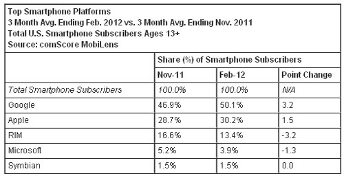 按截至今年2月份的三個(gè)月的平均數(shù)計(jì)算,美國智能手機(jī)用戶數(shù)超過1.04億人,相比截止去年11月的三個(gè)月的平均數(shù)增長(zhǎng)14%。谷歌Android操作系統(tǒng)在美國手機(jī)市場(chǎng)的份額超過50%,相比去年同期上升了17個(gè)百分點(diǎn);蘋果iOS操作系統(tǒng)排名第二,其市場(chǎng)份額為30.2%(與去年同期相比上升了5個(gè)百分點(diǎn));其后依次是RIM黑莓操作系統(tǒng)的13.4%,微軟Windows