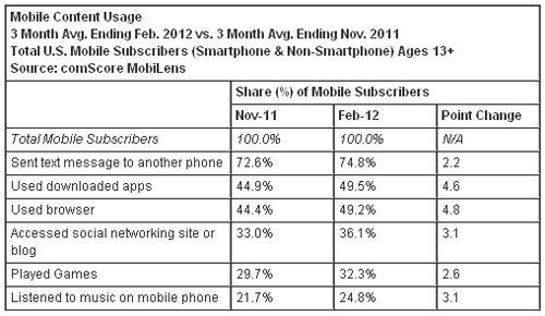 按截至今年2月份的三個(gè)月的平均數(shù)計(jì)算,美國手機(jī)用戶中有74.8%的用戶利用手機(jī)發(fā)送短信,相比截止去年11月的三個(gè)月上升2.2個(gè)百分點(diǎn);有49.5%的用戶使用了下載的應(yīng)用程序(上升4.6個(gè)百分點(diǎn)),有49.2%的用戶使用瀏覽器(上升4.8個(gè)百分點(diǎn)),有36.1%的用戶訪問社交網(wǎng)站或博客(上升了3.1個(gè)百分點(diǎn));有32.3%有用戶利用手機(jī)玩游戲(上升2.6個(gè)百分點(diǎn)),有24.8%的用戶利用手機(jī)聽音樂(上升3.1個(gè)百分點(diǎn))。
