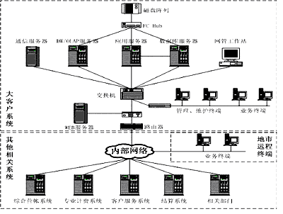 DW/OLAP服務(wù)器具有數(shù)據(jù)的采集、分析等功能,通信服務(wù)器主要實現(xiàn)大客戶管理系統(tǒng)與外部系統(tǒng)的接口及轉(zhuǎn)換,Web服務(wù)器則支持軟件B/S模式的實現(xiàn)。其它設(shè)備則包括網(wǎng)管工作站(如:HP