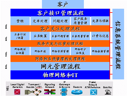 Assurance)的定義是,提供量化的測量指標(biāo),確保網(wǎng)絡(luò)服務(wù)能夠達到客戶所訂購的要求。(Service Usage)的定義是,測量電信網(wǎng)絡(luò)中各種業(yè)務(wù)的使用情況,計算處理使用電信業(yè)務(wù)的應(yīng)收費用,并對電信業(yè)務(wù)的收費過程提供支持。這是從縱向的角度來看,而從橫向的角度來看,從電信管理的角度來看,OSS主要處在三個管理層面:客戶服務(wù)層;業(yè)務(wù)管理層;網(wǎng)絡(luò)管理層。