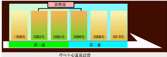 在合力金橋軟件公司的副總裁盧毅看來,1998年以前是呼叫中心在中國(guó)市場(chǎng)的導(dǎo)入期,1998~2005年第一波呼叫中心的建設(shè)期,直接促成了整個(gè)市場(chǎng)的擴(kuò)大和呼叫中心座席數(shù)的大幅增加;在2006年~2010年,由于受到中國(guó)加入WTO、2008年北京舉辦奧運(yùn)會(huì)、2010年上海舉辦世界博覽會(huì)等社會(huì)政治、經(jīng)濟(jì)事件的推動(dòng),將會(huì)出現(xiàn)第二波的呼叫中心建設(shè)風(fēng)潮;而從2002年~2006年中期是個(gè)調(diào)整期,第一波的呼叫中心建設(shè)此時(shí)進(jìn)入運(yùn)營(yíng)期和消化期,同時(shí)為第二波的建設(shè)應(yīng)用積蓄力量。