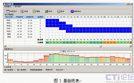 引入呼叫中心排班系統(tǒng)是提升坐席資源利用率的有效解決方案,排班系統(tǒng)可以對(duì)大量的歷史呼叫數(shù)據(jù)進(jìn)行分析,并剔除特殊事件對(duì)呼叫量的影響,從而得出呼叫量變化的規(guī)律曲線(xiàn),再輔助對(duì)特殊預(yù)期事件影響度的疊加,可以對(duì)未來(lái)一定時(shí)間的呼叫量變化做出比較客觀的預(yù)測(cè)(圖2)。在預(yù)測(cè)話(huà)務(wù)量變化曲線(xiàn)的同時(shí),結(jié)合人員技能和班次設(shè)定,給出高擬合度的人工排班方案(圖3)。更為重要的是,成熟排班系統(tǒng)提供的話(huà)務(wù)預(yù)測(cè)模型多具備學(xué)習(xí)能力,能夠?qū)㈩A(yù)測(cè)的話(huà)務(wù)數(shù)據(jù)與實(shí)際話(huà)務(wù)數(shù)據(jù)進(jìn)行對(duì)比,從而不斷提高話(huà)務(wù)預(yù)測(cè)模型的預(yù)測(cè)精度。成熟排班工具可以在保持呼叫中心同等服務(wù)水平的前提下,降低人工坐席代表的投入數(shù)量,進(jìn)而釋放部分人工資源開(kāi)展其它業(yè)務(wù)。
