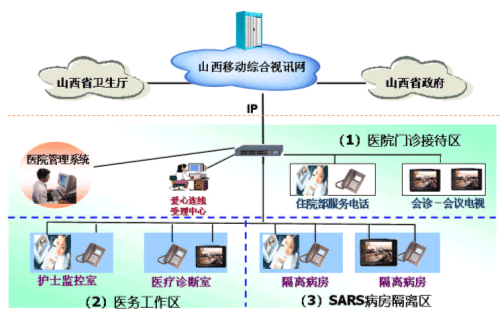 。。山西移動通信公司在獲悉遠程視訊業(yè)務可以有效預防SARS的情況下,隨即與山西省政府、省衛(wèi)生廳通電話,表達了山西移動愿意為山西防治SARS工作提供更先進的通信技術支持。山西移動與華為技術有限公司旋即制定了“愛心連線”遠程醫(yī)療、遠程探視實施方案,省衛(wèi)生廳及下屬太原市7家醫(yī)院要求盡快實施。目前該系統(tǒng)已經(jīng)在山西省山大第一醫(yī)院開通,正值國家衛(wèi)生部SARS督察小組在山西各大醫(yī)院視察“防非”工作,整個系統(tǒng)運行穩(wěn)定,在SARS的防治工作中發(fā)揮了重要作用。