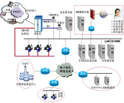 華為12345政府熱線系統(tǒng)解決方案,是一個集語音技術(shù)、通信技術(shù)、計(jì)算機(jī)網(wǎng)絡(luò)、數(shù)據(jù)庫技術(shù)于一體,支持電話、傳真、電子郵件、Web等多種媒體接入方式的呼叫中心解決方案。該系統(tǒng)充分考慮了政府服務(wù)熱線的現(xiàn)狀及存在的問題,并結(jié)合了政府特點(diǎn)的運(yùn)作模式,是華為公司在多年呼叫中心開發(fā)合作工作經(jīng)驗(yàn)積累基礎(chǔ)上推出的解決方案。整個系統(tǒng)整體結(jié)構(gòu)如下: