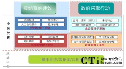 在架構(gòu)設(shè)計上,從電話接入、辦件流程、資料庫管理、信息維護到報表統(tǒng)計都實現(xiàn)了一體化設(shè)計理念。以業(yè)務(wù)流程設(shè)計為例,針對市民來電中的咨詢類的問題,12345政府熱線將直接由前臺接聽人員利用各部門預(yù)先錄入資料庫中的規(guī)范答案來回答市民的提問;對市民反映、建議、投訴類的來電,則由前臺記錄后轉(zhuǎn)給市信訪辦的后臺工作人員處理。一整套開放性的工作流和穩(wěn)定的技術(shù)后臺支持確保了市民可以在規(guī)定的時間內(nèi)得到政府的權(quán)威處理與回復(fù)。