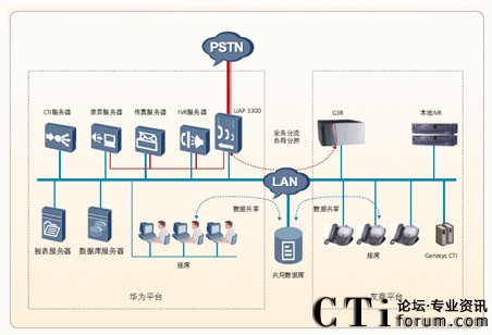 客戶(hù)電話(huà)通過(guò)PSTN統(tǒng)一由華為UAP3300排隊(duì)機(jī)接入,由華為平臺(tái)的IVR服務(wù)器進(jìn)行業(yè)務(wù)導(dǎo)航分流,根據(jù)用戶(hù)的選擇和IVR流程的配置進(jìn)行路由,可以選擇不同平臺(tái)來(lái)處理此業(yè)務(wù)。來(lái)話(huà)根據(jù)IVR流程路由后,兩個(gè)平臺(tái)采用負(fù)荷分擔(dān)方式進(jìn)行工作。在將來(lái)話(huà)導(dǎo)入兩個(gè)平臺(tái)后,采用不同設(shè)備的IVR進(jìn)行業(yè)務(wù)分配,不同平臺(tái)的座席處理不同的業(yè)務(wù)。在處理過(guò)程中,不同平臺(tái)的座席之間可以互轉(zhuǎn),達(dá)到全網(wǎng)資源共享的功能。