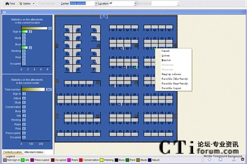 系統(tǒng)提供一整套管理工具,輔以圖形化的人性設(shè)計,將復(fù)雜的設(shè)備維護和系統(tǒng)優(yōu)化簡化為簡單的圖形管理,降低了維護難度和對維護人員的要求,提高了維護效率,使聯(lián)絡(luò)中心更為穩(wěn)定可靠地運行。座席地圖按真實座席位置展現(xiàn)座席狀態(tài),使業(yè)務(wù)代表服務(wù)質(zhì)量的監(jiān)控和檢查更為形象高效,有利于提升業(yè)務(wù)代表服務(wù)質(zhì)量。