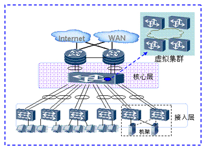 如上圖所示,整個數(shù)據(jù)中心網(wǎng)絡(luò)通過虛擬集群技術(shù),多個核心層設(shè)備虛擬為一臺設(shè)備。通過增加核心節(jié)點(diǎn),提供無阻塞的網(wǎng)絡(luò)能力,接入更多服務(wù)器。服務(wù)器的規(guī)?梢詮3000臺“無級擴(kuò)展”到數(shù)萬臺。在滿足企業(yè)日益增長的業(yè)務(wù)需求的同時,并不增加網(wǎng)絡(luò)的復(fù)雜度,減少管理和維護(hù)的成本。