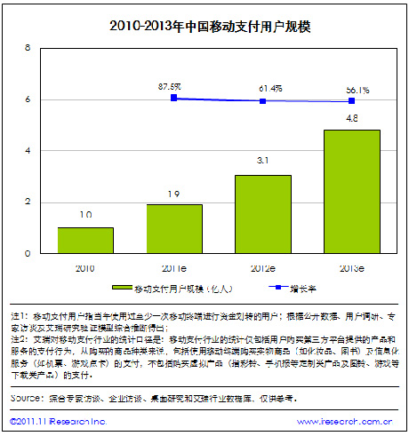 根據(jù)艾瑞咨詢統(tǒng)計(jì)數(shù)據(jù),2011年中國移動支付用戶規(guī)模將達(dá)到1.9億。艾瑞預(yù)計(jì),2013年中國移動支付用戶規(guī)模將達(dá)到4.8億。移動網(wǎng)上支付用戶規(guī)模的增長帶動了整個(gè)行業(yè)用戶規(guī)模的爆發(fā),另外手機(jī)短信支付也在用戶群體中得到了進(jìn)一步的普及。