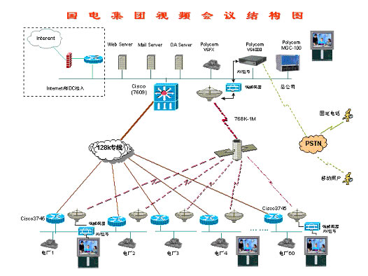 128,集團(tuán)下屬60個(gè)電廠均采用視頻終端ViewStation 128。整個(gè)網(wǎng)絡(luò)采用Polycom MCU的混速功能,在本部中心采用768Kbps進(jìn)行視頻傳輸,和下屬60個(gè)電廠及分公司采用128Kbps進(jìn)行傳輸。由于網(wǎng)絡(luò)傳輸線路分為衛(wèi)星線路和地面有線網(wǎng)絡(luò),衛(wèi)星線路帶寬為768Kbps-1Mbps,用于業(yè)務(wù)下行線路,地面有線網(wǎng)絡(luò)128Kbps用于視頻回傳。根據(jù)網(wǎng)絡(luò)傳輸線路的實(shí)際情況,在本部中心利用1臺(tái)視頻終端將其模擬信號(hào)(AV信號(hào))送到衛(wèi)星端接設(shè)備(包含MODEM,編解碼器等),將模擬信號(hào)轉(zhuǎn)換成數(shù)字信號(hào)(MPEG4),利用768K-1Mbps衛(wèi)星線路廣播到每個(gè)接收點(diǎn),通過每個(gè)接收點(diǎn)的編解碼器將數(shù)字信號(hào)轉(zhuǎn)換成模擬信號(hào)連接到顯示終端(如TV、顯示器)上進(jìn)行收看,通過這種方式可以實(shí)現(xiàn)利用衛(wèi)星線路的高帶寬,并利用其廣播特性,節(jié)省投資。