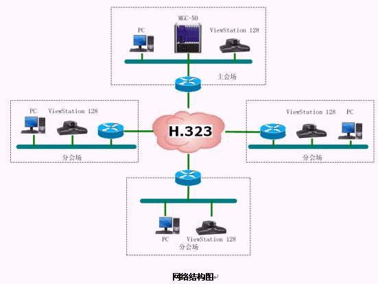 結(jié)合遼寧省消防網(wǎng)絡(luò),本方案設(shè)計的視頻會議系統(tǒng)承載在遼寧省消防局的IP網(wǎng)絡(luò)平臺上,采用國際流行的ITU H.323通信標(biāo)準(zhǔn)。系統(tǒng)采用以MCU為中心輻射各個會場電視會議終端的星型網(wǎng)絡(luò)結(jié)構(gòu)。整套系統(tǒng)由16個會場組成,采用美國Polycom公司的ViewStation 128會議室型終端設(shè)備。網(wǎng)管中心安放一臺Polycom 公司的MGC-50(多點會議控制單元),用于對全網(wǎng)終端的控制,實現(xiàn)多點、點對點的會議。
