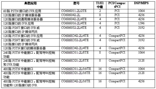 Call ControlTM(NCC)。CG 6060 PCI板卡和CG 6060C CompactPCI板卡是研制經(jīng)濟型應用系統(tǒng)的理想選擇,可研制的應用系統(tǒng)類型包括:媒體服務器、增強服務平臺、IVR、會議應用、消息處理、IP集中交換解決方案等。