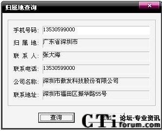 在A8電腦傳真機(jī)的電話商務(wù)通主界面,點(diǎn)擊歸屬地按鈕,出現(xiàn)手機(jī)歸屬地查詢界面,輸入手機(jī)號碼,點(diǎn)擊查詢,界面上會顯示出該手機(jī)的歸屬地,如果此號碼已在電話簿中,則界面上會同時顯示該電話對應(yīng)的聯(lián)系人信息。