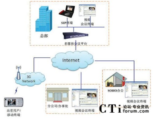 本系統(tǒng)通常將會(huì)議系統(tǒng)安裝于公司總部,應(yīng)用服務(wù)器與媒體服務(wù)器全部實(shí)現(xiàn)雙掛,同時(shí)接入公司內(nèi)網(wǎng)和公網(wǎng)。各分公司安裝的視頻數(shù)據(jù)會(huì)議終端、SIP話機(jī),通過Internet或?qū)>聯(lián)接到總部會(huì)議服務(wù)器的公網(wǎng)出口。公司內(nèi)部辦公室、會(huì)議室的視頻數(shù)據(jù)會(huì)議終端、SIP話機(jī),通過局域網(wǎng)連接到會(huì)議服務(wù)器。會(huì)議服務(wù)器通配合IPPBX、語(yǔ)音網(wǎng)關(guān),接入外線,實(shí)現(xiàn)普通電話和手機(jī)接入會(huì)議。全面支持IP電話和模擬電話。當(dāng)遠(yuǎn)程用戶沒有條件進(jìn)行視頻數(shù)據(jù)會(huì)議時(shí),可以單獨(dú)使用音頻,或者音頻+數(shù)據(jù)的方式進(jìn)行會(huì)議,以保證在網(wǎng)絡(luò)條件很差時(shí)也能夠進(jìn)行協(xié)同辦公。本系統(tǒng)采用不同級(jí)別的IPPBX或語(yǔ)音網(wǎng)關(guān)直連FXO口接入PSTN市話,保留了傳統(tǒng)的模擬電話線路。