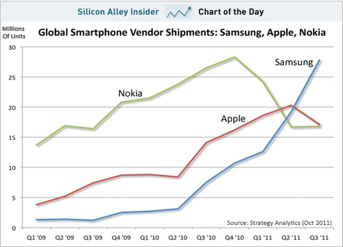 圖:全球智能手機(jī)出貨量:諾基亞、三星和蘋果