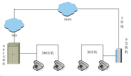 據(jù)了解,該門業(yè)企業(yè)本次將北京的兩個(gè)辦公地點(diǎn)(總部和廠區(qū))率先進(jìn)行了嘗試。之前兩處均NEC交換機(jī),中繼為電信DID接入(線數(shù):300+)尚有20個(gè)號碼可用。企業(yè)希望能加強(qiáng)通訊管理,將廠區(qū)通訊系統(tǒng)與總部通訊系統(tǒng)合二為一,費(fèi)用和管理均在總部進(jìn)行。