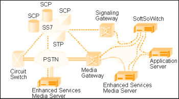 在PSTN網(wǎng),交換機(jī)組、SCP(Service Connection Points)和媒體服務(wù)器協(xié)同工作,為用戶提供服務(wù)。在包交換網(wǎng)絡(luò)環(huán)境,這種服務(wù)由軟件交換機(jī)(Softswiches)、媒體服務(wù)器和應(yīng)用服務(wù)器協(xié)同提供。連接這兩種網(wǎng)絡(luò)的橋梁是媒體網(wǎng)關(guān)和信令網(wǎng)關(guān)。值得注意的是,包交換中的部件都是邏輯點(diǎn),其多個(gè)部件可能僅僅由網(wǎng)絡(luò)中的一個(gè)應(yīng)用硬件平臺(tái)提供。例如:一個(gè)基于網(wǎng)絡(luò)提供語音識(shí)別功能的語音郵件系統(tǒng)可能包括如下模塊: