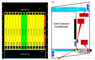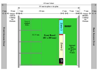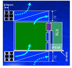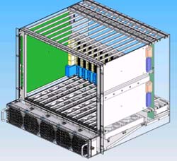 另外在機架內的放置空間上,42U的標準機架里可以放3臺12~14U機箱,若將機箱降至10U則可以放置4臺,這樣可以增加整體空間的利用率,所以有了10U機箱的設計需求。在各種不同高度的機箱設計中,風扇散熱系統的放置位置、方式與總散熱效能能夠達到200*14=2800W,將會是ATCA機箱設計所要考慮的最重要因素之一,尤其是在10U的機箱設計上。