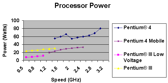 在CompactPCI演進的歷史軌跡中,x86處理器已經(jīng)經(jīng)歷過非常顯著的變化。有些非常早期的卡板用的是66MHz的CPU,目前這一代的x86產(chǎn)品,包含了1.7GHz Mobile Pentium 4 CPU。在嵌入式工業(yè)對支持長生命周期的產(chǎn)品需求,造成了產(chǎn)品制造廠在處理器的選擇上,傾向從嵌入式或有長周期支持的產(chǎn)品線去選擇。這些產(chǎn)品并不像桌上型計算機或服務器的處理器那樣走得那么先端,這些產(chǎn)品的生命周期是用年而不是用月來計算的。此外,這個產(chǎn)業(yè)也藉由使用mobile processor而取得一些優(yōu)勢,這種處理器在電源供應的需求上和嵌入式以及電信領(lǐng)域的應用非常類似。下圖提供了Pentium各系列的處理器與其功率消耗的一個關(guān)連性,可以看到Pentium III與Mobile Pentium 4處理器家族的產(chǎn)品符合了今日CompactPCI板卡對處理器所提供的30Watts功率規(guī)格。