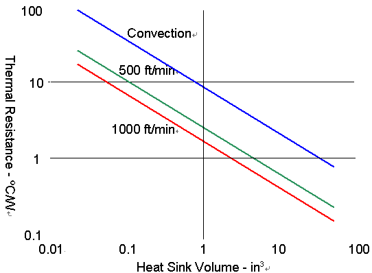 從圖上可以看出散熱片的散熱能力并不和風速成一線性函數(shù),在熱阻上一個非常顯著的改善,會在稍呈對流狀態(tài)的空氣與每分鐘500英尺的風速情況下顯現(xiàn)出來,但是從每分鐘500英尺增加到每分鐘1000英尺的風速時,熱阻的改善就沒那么顯著了。另一個用吹風方式的限制因素是噪音,當吹過卡板與散熱片的風速增加時,所產(chǎn)生的噪音也會增加。從實務面來看,大部分的CompactPCI機箱提供每分鐘300英尺的風速,如先前提到的,散熱片通常會被內(nèi)存以及PMC的空間給限制了大小,一個CompactPCI卡板若含有兩個PMC的設計,通常會有一個處理器散熱片的大小約為3