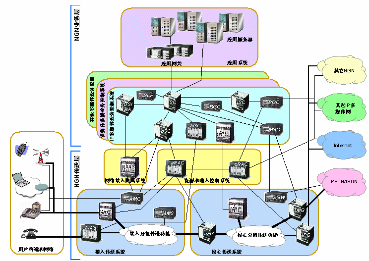 NGN是基于分組技術(shù)和多層網(wǎng)絡(luò)結(jié)構(gòu)的未來(lái)電信網(wǎng)絡(luò)。它可支持所有可能的業(yè)務(wù),包括使用各種媒體類(lèi)型和轉(zhuǎn)播方式的、具有不同性能要求的業(yè)務(wù)。它的業(yè)務(wù)與傳送分離、控制與用戶(hù)數(shù)據(jù)處理分離的構(gòu)架允許網(wǎng)絡(luò)中各個(gè)部件可分別配備和獨(dú)立發(fā)展。業(yè)務(wù)的提供采用具有開(kāi)放接口的業(yè)務(wù)平臺(tái),可以為第三方業(yè)務(wù)提供者所使用。傳送層采用可支持不同帶寬和端到端QoS能力的技術(shù)。NGN控制功能可分布于現(xiàn)有和新的網(wǎng)絡(luò)基礎(chǔ)設(shè)施上并可按組網(wǎng)的要求采用不同的組合形式。網(wǎng)關(guān)提供NGN不同域之間或NGN和現(xiàn)有網(wǎng)絡(luò)之間的互通。NGN支持通用移動(dòng)性,使用戶(hù)或其他移動(dòng)體無(wú)論其位置或技術(shù)環(huán)境的變化都能進(jìn)行通信和接入業(yè)務(wù)。它允許用戶(hù)可以跨越不同的有線或無(wú)線接入技術(shù),跨越現(xiàn)有網(wǎng)絡(luò)的界限使用他們的業(yè)務(wù)。