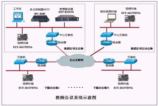 整個(gè)視頻會議系統(tǒng)采用EC5-1611VDNA作為會議室型視頻終端及FSC-1713VNA作為多點(diǎn)會議服務(wù)器?梢栽O(shè)立一個(gè)或者多個(gè)中心,通過數(shù)字傳輸信道,星形級聯(lián)而成。