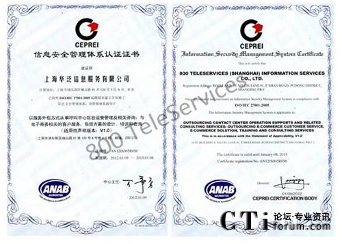 CTI論壇(ctiforum)1月31日消息(記者 浩宇):2012年1月,著名的服務(wù)外包呼叫中心和電子商務(wù)運(yùn)營(yíng)中心企業(yè)--飛翱集團(tuán)旗下全資子公司上海華泛信息服務(wù)有限公司---,繼2009年獲得ISO9001 質(zhì)量管理體系國(guó)際認(rèn)證后。經(jīng)過半年嚴(yán)格的綜合考評(píng),再次成功獲得又一由國(guó)際上公認(rèn)的ISO/IEC 27001:2005(也簡(jiǎn)稱為:ISO27001)并獲得具有美國(guó)認(rèn)證機(jī)構(gòu)國(guó)家認(rèn)可委員會(huì)ANAB授予的雙重信息安全管理體系認(rèn)證。