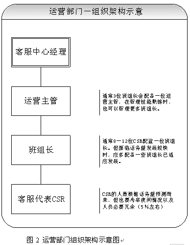 關(guān)于團(tuán)隊的建設(shè),應(yīng)該首先考慮組織架構(gòu)的設(shè)立。從運營角度講,設(shè)置客服中心經(jīng)理、運營主管、班組長、客服代表都是必須的。當(dāng)然根據(jù)不同的規(guī)模,也可以增加或者減少層級。具體建議請見圖2所示。除了運營之外,對于大型呼叫中心(50坐席以上,或者業(yè)務(wù)較為復(fù)雜的),也應(yīng)考慮相關(guān)部門的設(shè)立。比如客戶關(guān)注組,可以負(fù)責(zé)疑難問題解決、工單流轉(zhuǎn)、投訴處理、建議處理、知識庫建設(shè)采編等等;培訓(xùn)組可以負(fù)責(zé)管理、組織、實施員工培訓(xùn);技術(shù)維護(hù)組可以負(fù)責(zé)系統(tǒng)維護(hù)、網(wǎng)絡(luò)維護(hù)、新項目應(yīng)用界面開發(fā)、部分系統(tǒng)優(yōu)化;綜合行政可以負(fù)責(zé)人事、行政等事務(wù)。