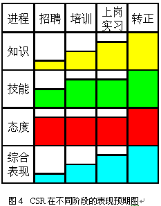 即使經(jīng)過規(guī)范的上崗培訓(xùn)與考核,新員工通常也只達(dá)到老員工70%左右的表現(xiàn)。因此制定明確的實習(xí)期,在實習(xí)期間加強(qiáng)指導(dǎo)和培養(yǎng)是非常重要的。通常經(jīng)過3個月的實習(xí),新員工已經(jīng)可以達(dá)到一個標(biāo)準(zhǔn),這時便可以轉(zhuǎn)正了。圖3和圖4表現(xiàn)了不同階段對CSR的不同預(yù)期,以及不同階段的主要工作。