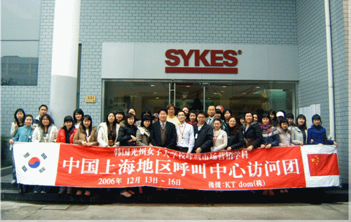 2006年12月14日上午,韓國(guó)光州女子大學(xué)呼叫市場(chǎng)營(yíng)銷系30多名大學(xué)學(xué)生 在鄭成教授等的帶領(lǐng)下,專程來(lái)滬參觀訪問賽科斯(Sykes)公司。韓國(guó)光州女子大學(xué)是韓國(guó)第一個(gè)設(shè)立呼叫市場(chǎng)營(yíng)銷專業(yè)的大學(xué),該專業(yè)為四年制本科,學(xué)生畢業(yè)后主要從事客戶服務(wù)行業(yè)的基層管理崗位工作。