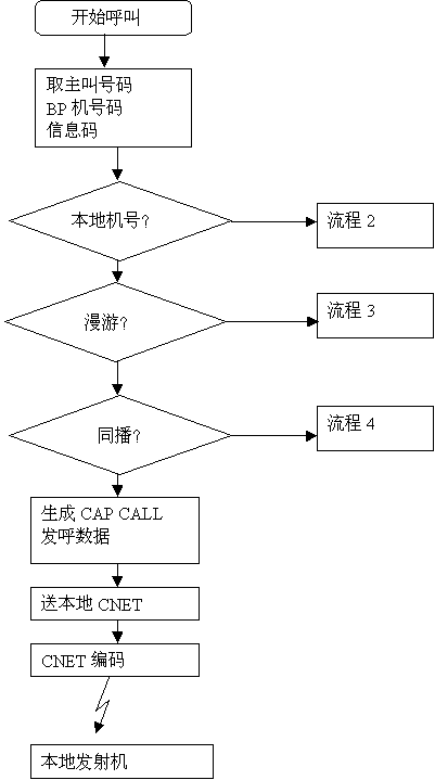 異地呼叫漫游到本地的異地機(jī)時(shí),異地發(fā)出的CAP CALL會(huì)送入本地發(fā)呼工作站,發(fā)呼工作站僅修改其目的地址,把它轉(zhuǎn)發(fā)給本地CNET由CNET送到編碼器編碼后送到發(fā)射機(jī)發(fā)射,完成呼叫過程。詳見流程5。
