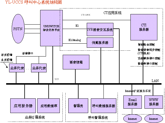 宇龍UCCS呼叫中心系統(tǒng)是一個(gè)能提供綜合性服務(wù)的呼叫平臺(tái),它由新一代的綜合交換平臺(tái)、CTI服務(wù)器、IVR語(yǔ)音交互系統(tǒng)、系統(tǒng)管理臺(tái)、人工業(yè)務(wù)代表、應(yīng)用代理服務(wù)器等六大模塊組成。