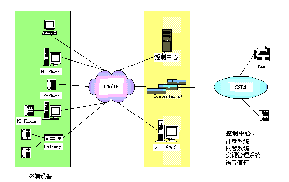 控制中心:包括資源管理系統(tǒng)、計(jì)費(fèi)系統(tǒng)、網(wǎng)管系統(tǒng)、語(yǔ)音信箱。 其中,資源管理系統(tǒng)主要執(zhí)行地址翻譯、權(quán)限控制、路由管理等功能;計(jì)費(fèi)系統(tǒng)主要完成計(jì)費(fèi)及結(jié)算功能;網(wǎng)管系統(tǒng)完成對(duì)網(wǎng)絡(luò)及IP PBX運(yùn)行的維護(hù)管理