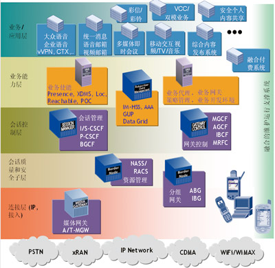 。。阿爾卡特朗訊會話管理實現(xiàn)IMS的P-CSCF、I/S-CSCF和BGCF的功能,網(wǎng)關控制包括MGCF和IBCF。會話管理支持2G/3G的GGSN、CAMD的PDSN、WLAN的PDG、固定有/無線的ABG的接入和會話處理。