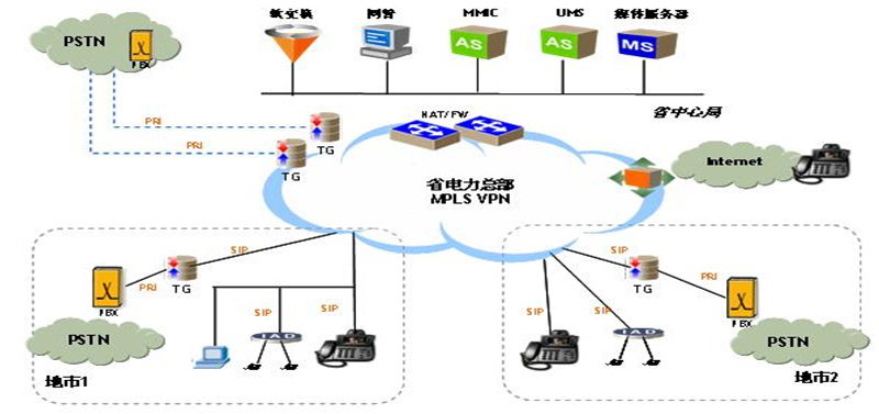 上海貝爾阿爾卡特的VoIP行業(yè)應用解決方案可以幫助電力行業(yè)用戶提供可定制、可管理的VOIP增值業(yè)務,包括IP Centrex、VPN、IP多媒體會議、Web 呼叫中心、一號通、Web800、統(tǒng)一消息、電子商務等多種業(yè)務。網(wǎng)絡拓撲圖如下:
