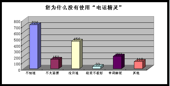 尚有相當(dāng)多地區(qū)沒有開通此類服務(wù),用戶感到遺憾。在“您為什么沒有使用‘電話精靈’?”的統(tǒng)計結(jié)果中“當(dāng)?shù)貨]有開通”是一項主要原因,有不少用戶都留言希望能將電話精靈業(yè)務(wù)在更廣泛地區(qū)應(yīng)用。曾經(jīng)使用過“電話精靈”,但后期由于運營商停止了此項業(yè)務(wù)而不再使用的用戶也深感遺憾。