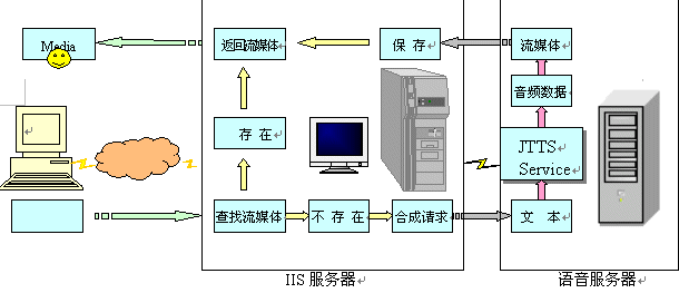 語音服務器方案是指利用捷通華聲在CTI領域成熟應用的jTTS Service語音服務器,增加一臺或多臺語音服務器到現有的IIS服務系統的網絡環(huán)境中;在IIS服務器中,增加訪問語音服務器的功能。當IIS服務器需要流媒體輸出時,向語音服務器發(fā)出請求,語音服務器接受IIS服務器的請求,并對請求的數據進行合成、格式轉換,得到流媒體后返回給IIS服務器,IIS服務器再將此流媒體傳輸給用戶。