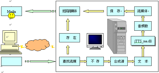 瀏覽器端(Explorer)發(fā)出瀏覽請求,網站服務器(IIS)根據請求查找流媒體(音頻流)文件,如有,則將流媒體返回客戶端,并啟動客戶端的MS media player播放流媒體。若沒有,則向語音服務器(jTTS Service)發(fā)出合成請求,并將所需合成的文本通過Socket接口傳送至語音服務器;語音服務器響應網站服務器的合成請求后,將調用jTTS合成技術進行語音合成,并調用WMF SDK將生成的音頻文件轉換成流媒體格式ASF;通過Socket接口返回IIS服務器端后,將此流媒體文件存儲到指定的Web目錄,同時將流媒體返回瀏覽器端,啟動MS media player播放。其流程如下: