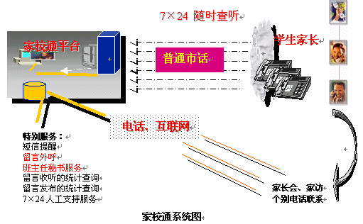 捷通華聲從關(guān)愛青少年成長出發(fā),提出了應(yīng)用于教育領(lǐng)域溝通平臺"家校通"系統(tǒng)的語音服務(wù)解決方案。家校通系統(tǒng)是一個融合了語音合成、計算機(jī)網(wǎng)絡(luò)集成綜合服務(wù)、互聯(lián)網(wǎng)、數(shù)據(jù)庫等多種先進(jìn)IT技術(shù)為一體的新一代家校聯(lián)系工具。它充分利用互聯(lián)網(wǎng)與目前最為普及的公眾電話等資源,為學(xué)校提供多樣化的信息發(fā)布渠道,同時強(qiáng)大的7×24小時的留言發(fā)布和查聽服務(wù)功能,為老師和家長提供一種全新、高效、便捷的交流方式,大大提高了家長的滿意度,提升了學(xué)校的管理實(shí)力。