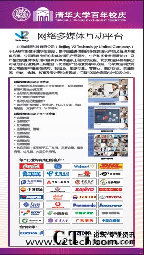 CTI論壇(ctiforum)5月3日消息(記者 張潔): 天行健,君子以自強(qiáng)不息,地勢坤,君子以厚德載物。2011年4月23日,清華大學(xué)迎來百年華誕。在建校百年之際,V2威速聯(lián)合母校----清華大學(xué)百年校慶辦展出了V2網(wǎng)絡(luò)多媒體互動平臺。V2威速眾多旗艦產(chǎn)品之一----V2網(wǎng)絡(luò)多媒體互動平臺始創(chuàng)于1999年清華大學(xué)第二屆“大學(xué)生創(chuàng)業(yè)比賽”。同年,V2威速于清華創(chuàng)業(yè)園創(chuàng)立,經(jīng)過11年的發(fā)展,V2威速已是中國值得信賴的多媒體通訊產(chǎn)品及解決方案供應(yīng)商。
