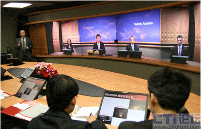 我們參與體驗(yàn)的8個人在面向屏幕的一側(cè)坐下,寶利通技術(shù)人員在位于會議桌正中的觸摸屏上輕輕點(diǎn)了一下,對面瞬間出現(xiàn)了4張微笑的面孔,整個畫面的色彩和亮度都非常柔和,感覺對面的座位突然間被坐滿了。技術(shù)人員介紹說我們已經(jīng)和澳大利亞辦公室接通了,我仔細(xì)觀察才發(fā)現(xiàn),除了背景墻上的“Sydney,
