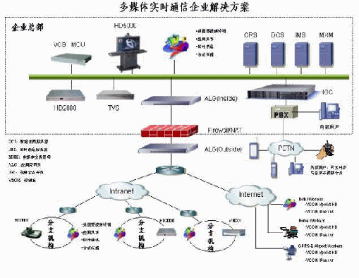VCON提供了以HD系列的視頻終端產(chǎn)品和以VCB系列的多點(diǎn)控制單元(MCU)產(chǎn)品來(lái)構(gòu)建基于IP網(wǎng)絡(luò),采用H.323協(xié)議作為標(biāo)準(zhǔn)協(xié)議的視頻通信解決方案。通常主會(huì)場(chǎng)選擇會(huì)議室型終端HD5000,該終端在64Kbit/s下就可以實(shí)現(xiàn)畫面流暢的動(dòng)態(tài)雙流;主會(huì)場(chǎng)也可以選擇機(jī)架式會(huì)議終端HD2000,這樣主會(huì)場(chǎng)可以選配正裝和吊裝攝像機(jī),拍攝會(huì)場(chǎng)不同角度的場(chǎng)景;多點(diǎn)控制單元(MCU)選擇VCB3000,同時(shí)可以為領(lǐng)導(dǎo)、個(gè)人桌面或者出差用戶單獨(dú)配置支持H.323標(biāo)準(zhǔn)的Vpoint HD軟終端,該終端是目前業(yè)界惟一支持H.264、雙流、組播接受以及遠(yuǎn)程控制的軟終端產(chǎn)品。
