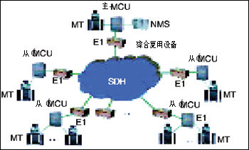 多點(diǎn)視頻會(huì)議系統(tǒng)主要由視聽(tīng)多媒體會(huì)議終端MT、通信傳輸網(wǎng)絡(luò)SDH、網(wǎng)絡(luò)節(jié)點(diǎn)的多點(diǎn)控制單元MCU、網(wǎng)絡(luò)管理系統(tǒng)NMS以及外圍設(shè)備等幾部分組成。由于通信網(wǎng)絡(luò)不同,會(huì)議電視系統(tǒng)的終端和多點(diǎn)控制單元MCU也不盡相同。例如,對(duì)于采用電路交換通信網(wǎng)絡(luò)的多點(diǎn)會(huì)議系統(tǒng)通過(guò)MCU實(shí)現(xiàn),而包交換通信網(wǎng)絡(luò)則通過(guò)多點(diǎn)會(huì)議服務(wù)器來(lái)實(shí)現(xiàn)多方會(huì)議。如圖: