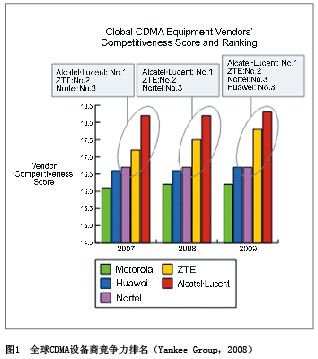 All-IP上的領先地位的進一步鞏固,中興通訊已經(jīng)成為全球CDMA的領導者, Yankee group 2008年的一份咨詢報告顯示,中興通訊CDMA綜合排名穩(wěn)居全球第一集團行列(見圖1)。