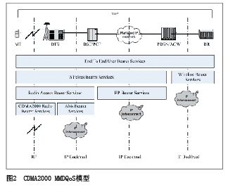 IMS是端到端的全IP架構,提供端到端的VoIP業(yè)務取代傳統(tǒng)的移動電話業(yè)務。對于VoIP電話,影響其發(fā)展的首要因素是需要提供完善的QoS機制來保證其話音質(zhì)量不差于傳統(tǒng)移動電話的話音質(zhì)量。圖2顯示了CDMA2000