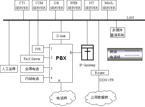 如下圖所示,當(dāng)呼叫從電話網(wǎng)進(jìn)入客戶服務(wù)中心時,PBX(用戶小交換機(jī))響應(yīng)客戶的呼叫,并將呼叫接至系統(tǒng)的IVR(交互式語音應(yīng)答系統(tǒng)),IVR向客戶送提示音:"您好,這里是×××保險公司,請注意:在任何步驟按0中止當(dāng)前操作退出,按*號轉(zhuǎn)傳真,按#轉(zhuǎn)人工坐席。請繼續(xù)操作:查詢公共信息請按1,查詢客戶檔案請按2,查詢營銷員信息請按3",當(dāng)客戶選擇查詢的信息時IVR進(jìn)一步提示直到客戶查到滿意的信息為止。提示語音文字的選擇應(yīng)結(jié)合當(dāng)?shù)乜蛻舻睦斫饬?xí)慣仔細(xì)斟酌。
